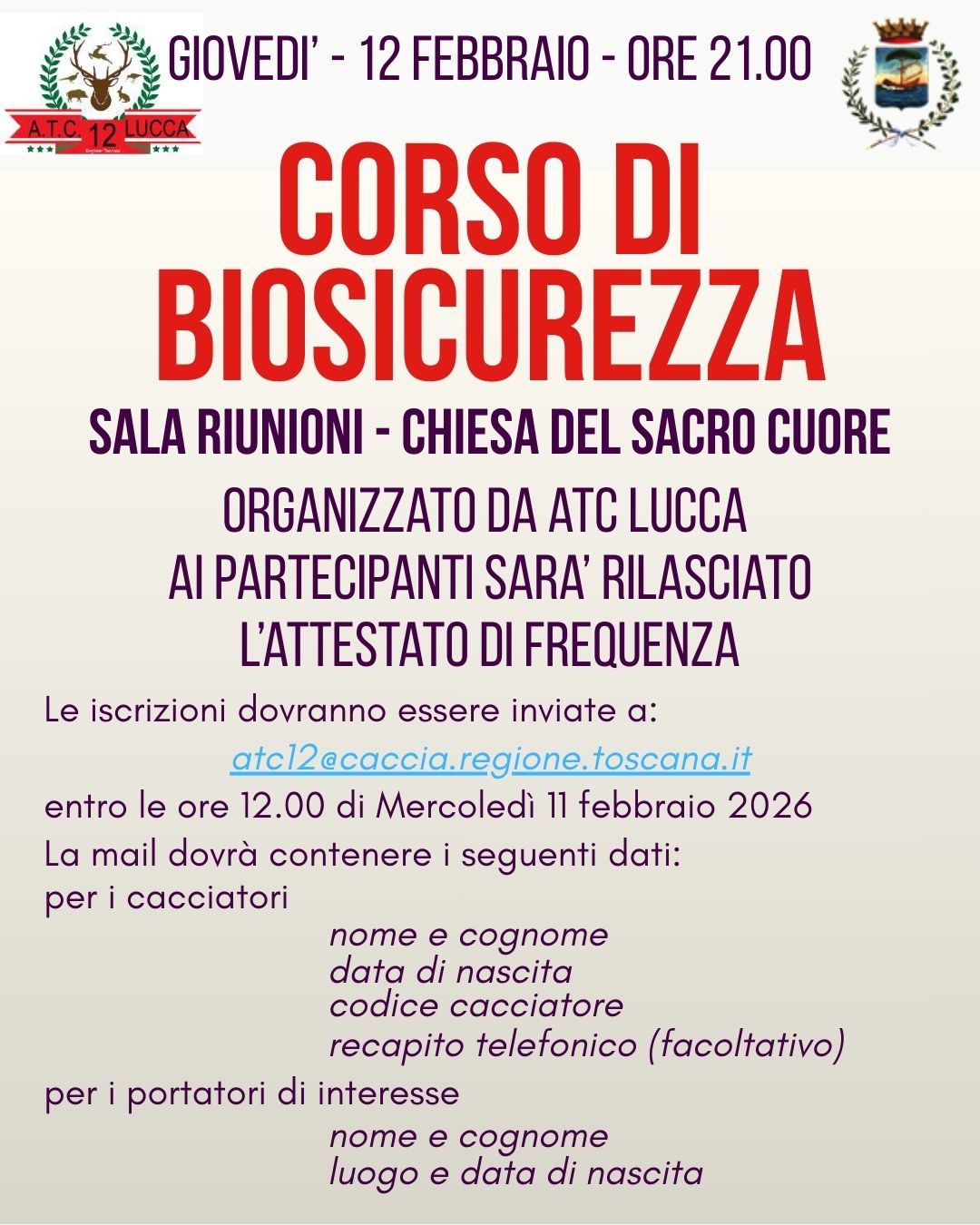 GIOVEDI’ 12 FEBBRAIO 2026 alle ore 21.00 presso l'Oratorio del Sacro Cuore si terrà un Corso sulla BIOSICUREZZA.