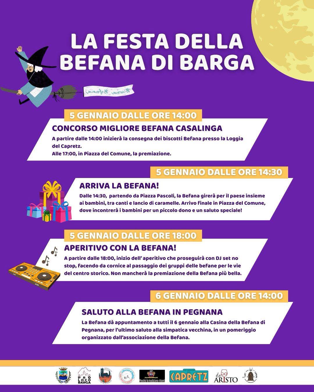 Dalle 18 alle 20 torna quindi la RASSEGNA DELLE BEFANE che fin da ora sono invitate a farsi vedere in piazza in questo orario per essere valutate da una giuria e cercare di vincere i riconoscimenti in palio.