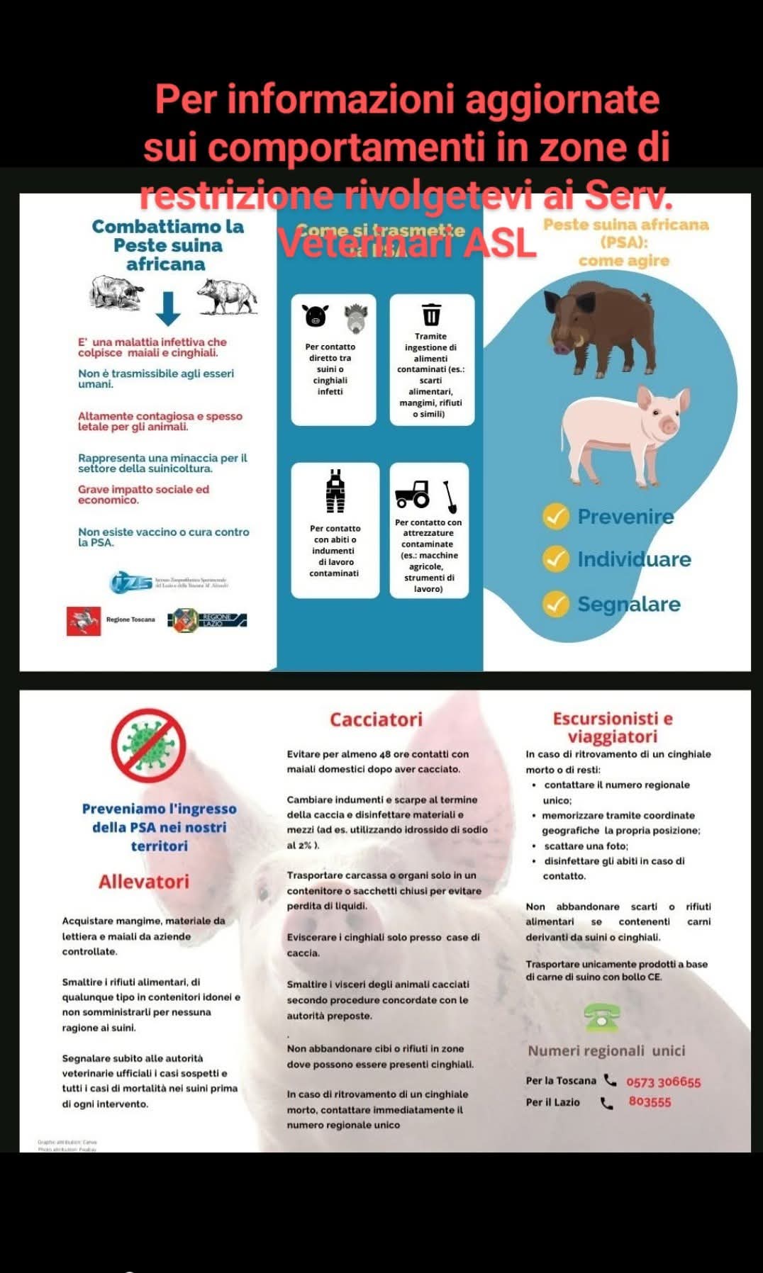 Opuscoli informativi diramati dalla Azienda USL Toscana nord ovest – Dipartimento di Prevenzione e predisposti dal Ministero della Salute in merito al corretto comportamento da avere per la prevenzione della trasmissione della Peste Suina Africana.